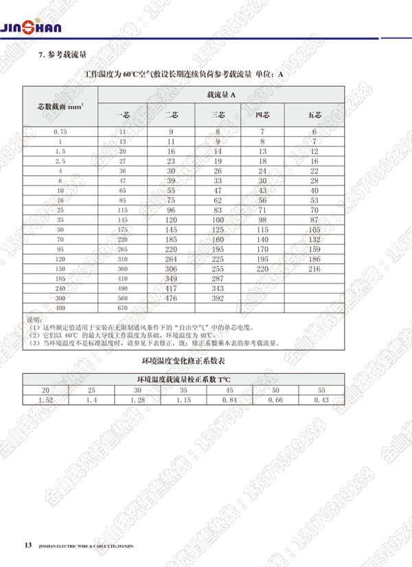 注意:使用参考载流量表时,注意实际使用环境,根据较正系数,计算实际载流量。