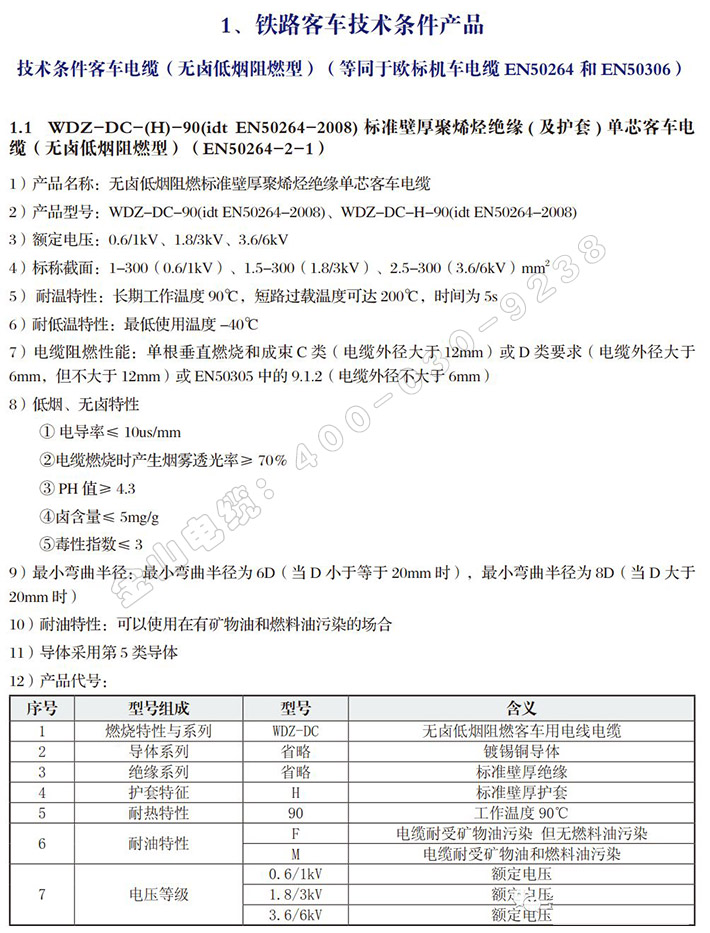 本产品铁路动车组电线WDZ-DC-90 WDZ-DC-H-90的执行标准为TJ/CL254-2013铁路客车技术条件标准。